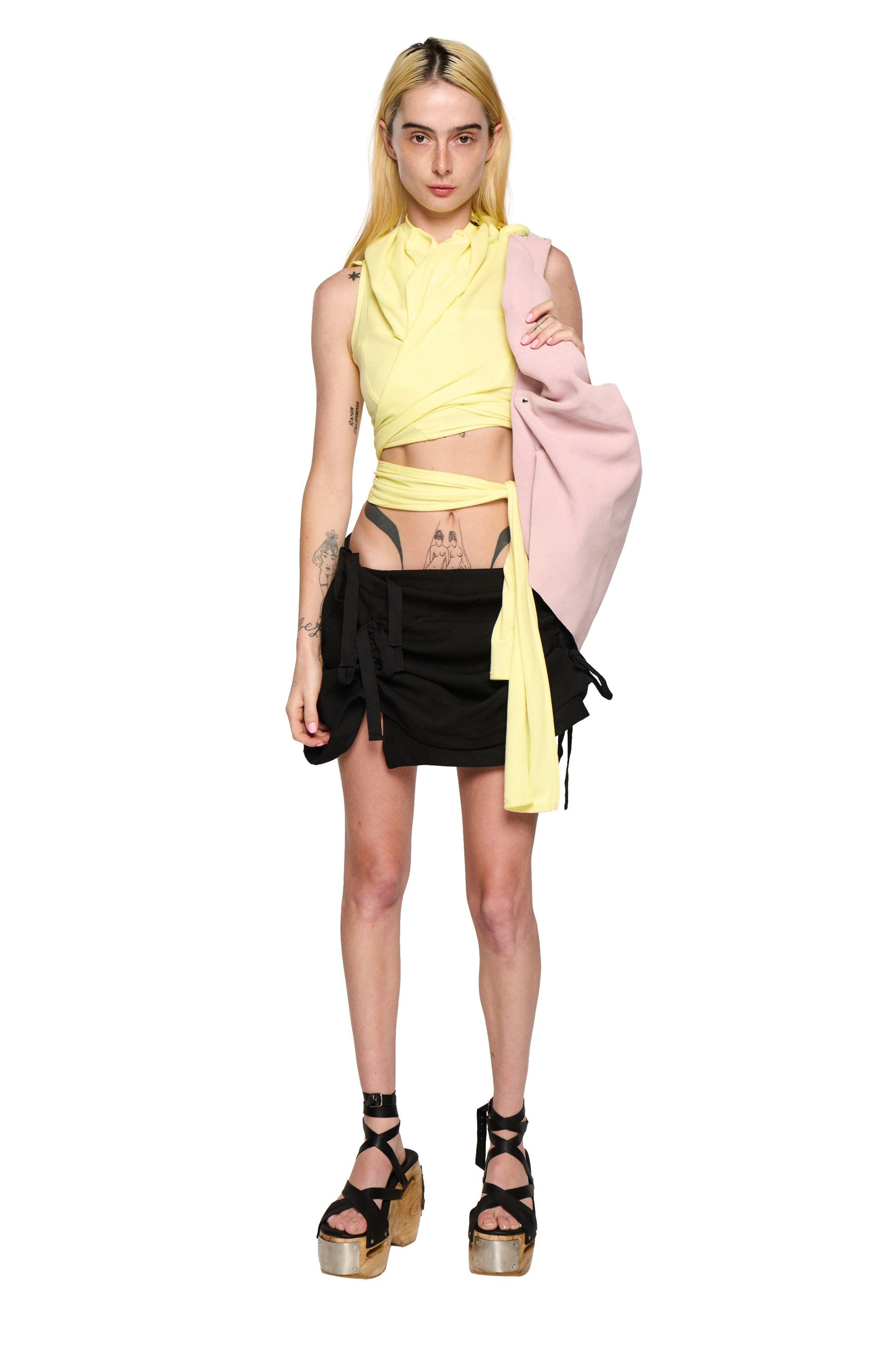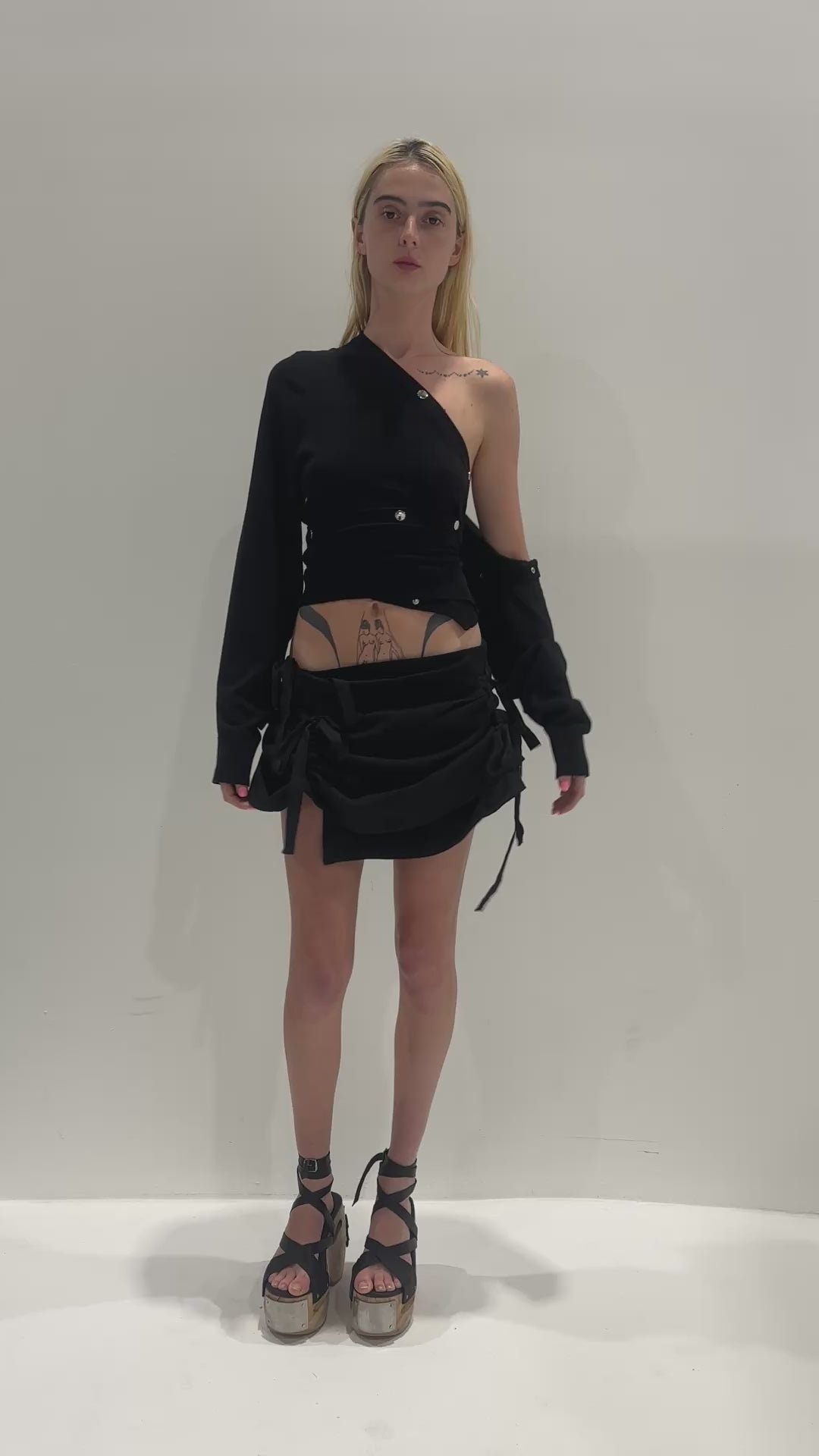 Ruched panel detailing throughout. Internal tie up for extendable features, allows the garment to be worn high or low on the waist. External lace up.