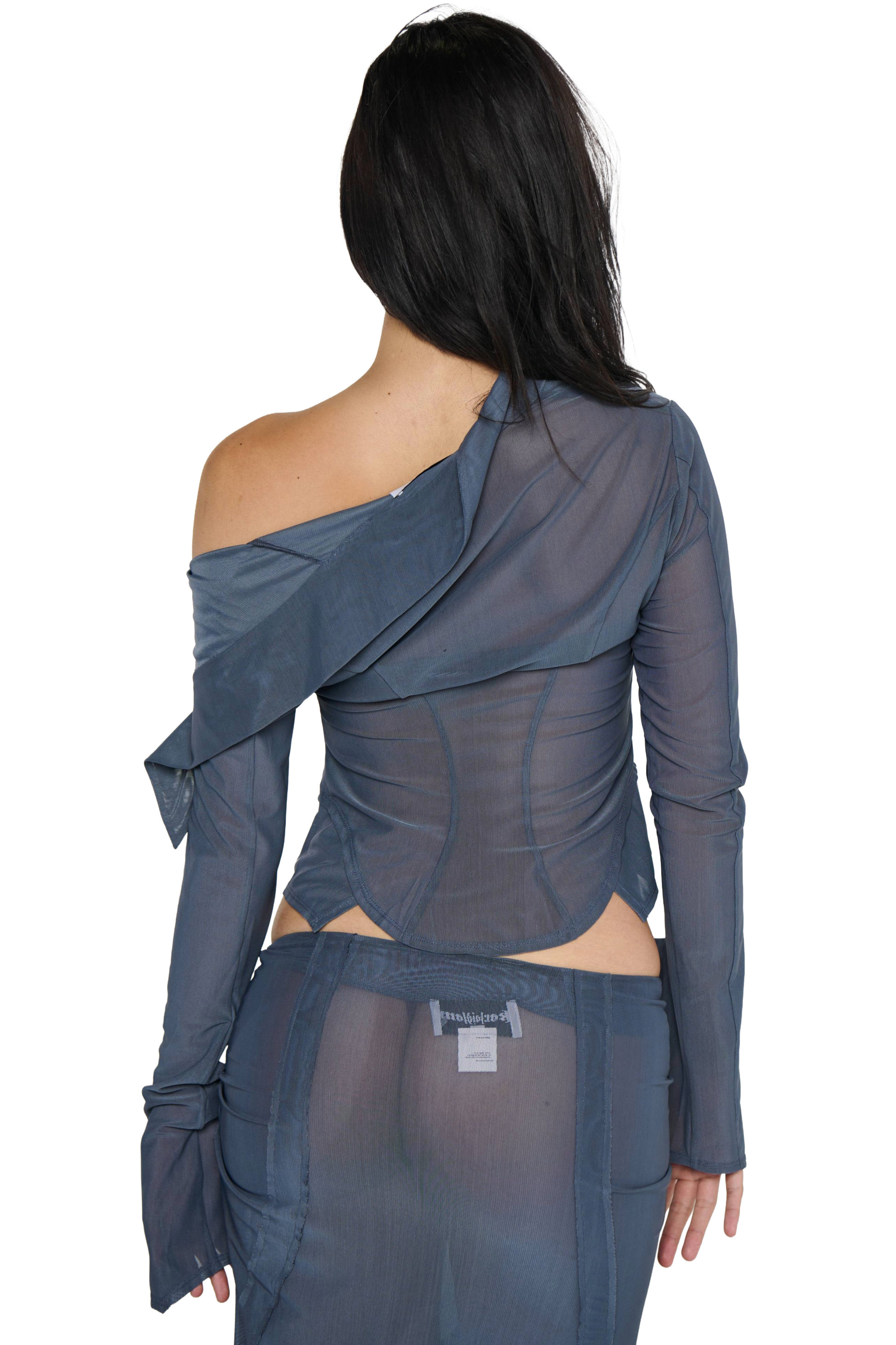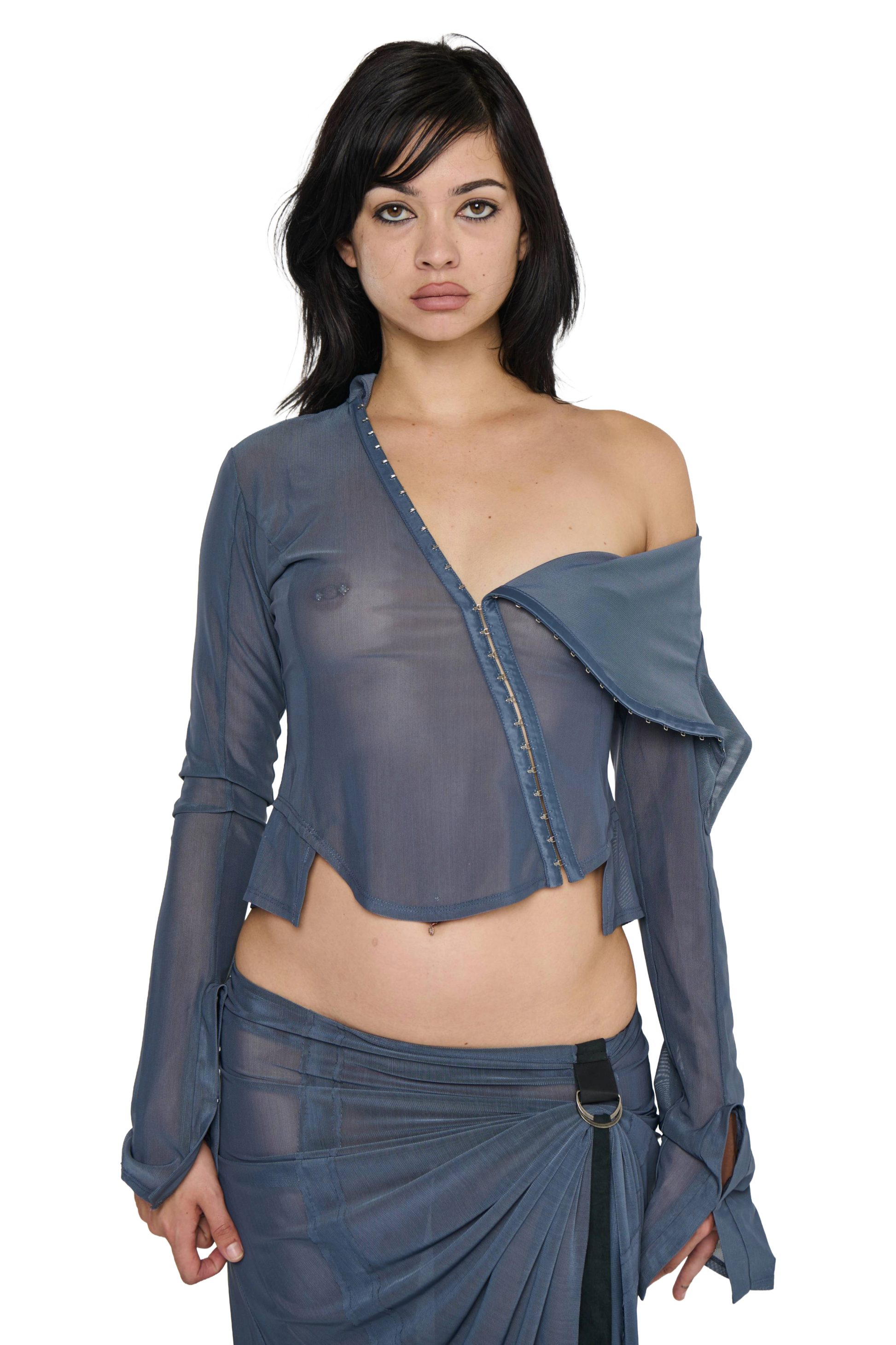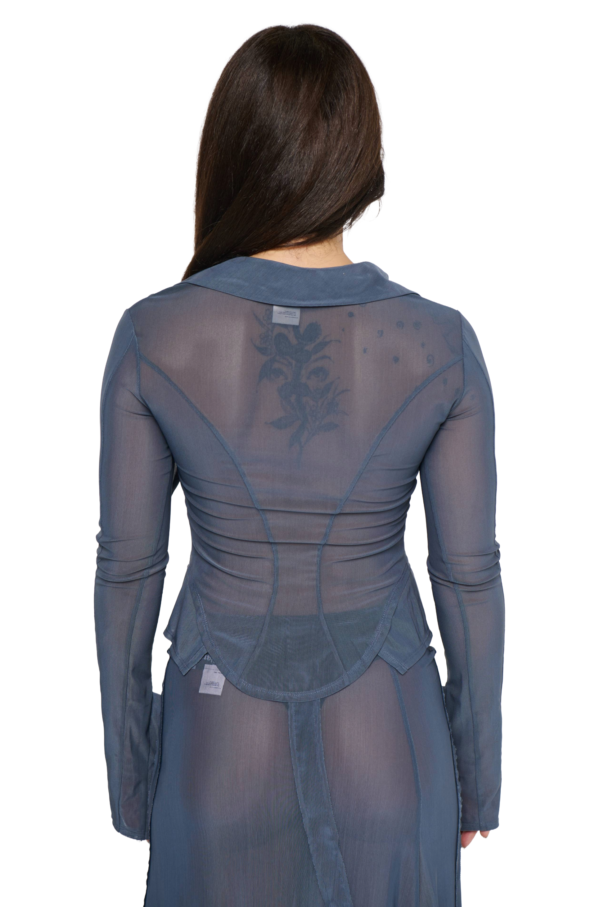 Lightweight Powermesh shirt, open neckline with extended lapel designed to drape over the shoulder. Hook and eye front closures and buttoned cuff opening. Added side panels to give the effect of a shirt under a shirt.