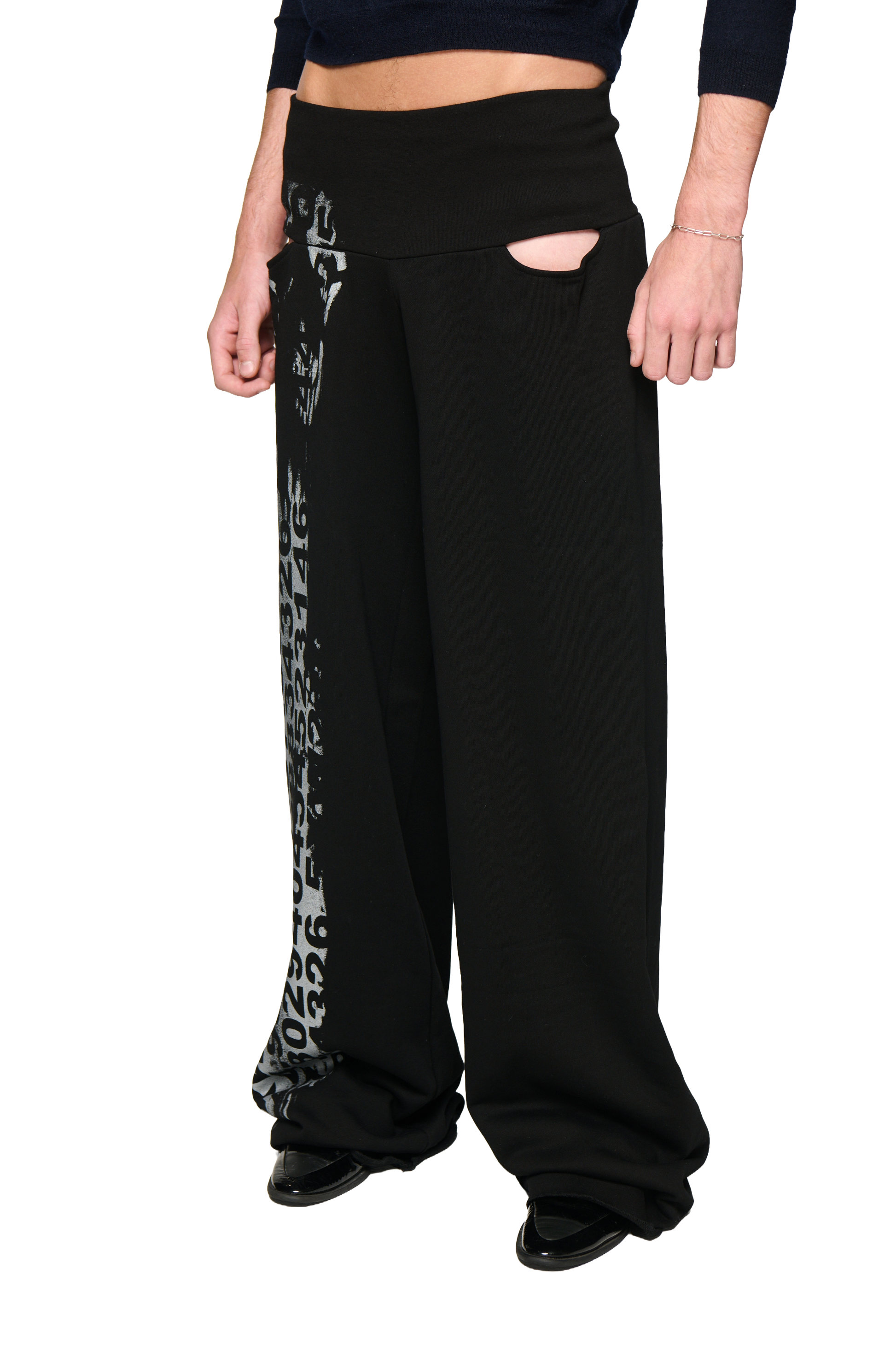 A wide-leg pant designed with our signature ribbed waistband and two front hole cut-outs (no pockets), creating a distinctive and sculptural silhouette.